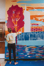 Jeudi matin, l’ambiance est un peu différente : le lieu est calme, en attendant son rush quotidien du midi. Je poursuis mon travail dans cette douceur matinale, en regardant les fourmis s’activer en cuisine! La routine est rodée! J’attaque les couleurs plus flashies : un fuchsia, du vert, du bleu électrique… ça attise les curieux! Un arbre sort de terre, un deuxième… Petite déconvenue : la peinture n’est pas assez couvrante, il me faudra donc en appliquer plusieurs épaisseurs (4 ou 5 par endroits!). Je lunch avec l’équipe, l’occasion de réaliser que Marion (aux RH) et moi, avons grandi à quelques centaines de mètres l’une de l’autre, en banlieue parisienne! Le monde est petit! En après midi, mon amie Jani vient s’installer au piano, elle chante, et sa voix nous enveloppe. Les usagers sont heureux de voir l’art sous plusieurs de ses formes venir habiter le lieu. Incarner un milieu de vie est d’ailleurs un des souhaits du Chic. On termine la journée par un 5 à 7 suivi d’un bowling au mythique Darling avec l’équipe, qui m’invite généreusement à me joindre (“tu fais partie des murs maintenant!”, plaisante Bruno)
